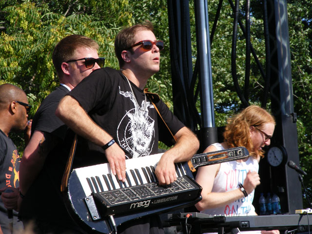 After a somewhat wispy start to Saturday, Delorean came in and delivered a sun-baked set that got the crowd moving despite the heat. Getting indie kids to dance is challenge number one, but doing so under those conditions takes something special. Plenty of water was handed out before, during and after that set, and it was the first time all festival that people were legitimately crowd surfing. Again in the category of “something completely different”, Titus Andronicus followed Delorean and played a high energy old fashioned rock and roll show. There were guitars and piano and horns and special guests brought out on stage, all while frontman Patrick Stickles got the crowd all riled up. Fists were raised and pumped, bodies were hoisted and passed around, and lyrics were shouted with enthusiasm. What more could you ask for? Wolf Parade also did an admirable job playing in the same time slot and stage that Robyn had appeared on the day before. Spencer Krug and Dan Boeckner make for a mighty fine duo on stage, as they traded songs and sometimes verses in a fashion that almost seemed like an attempt at one-upsmanship. They were also smart enough to play an energetic mix of older and newer stuff. “What Did My Lover Say? (It Always Had to Go This Way)” and “Palm Road” sounded particularly vibrant, while classic tracks like “I’ll Believe in Anything” and “This Heart’s on Fire” hit with the immediacy they’re supposed to. And when it came to headliners, the possibility that LCD Soundsystem might be playing their last ever show in Chicago made their set extra special. James Murphy and Co. also crafted a smart set list that pretty equally covered all three albums and their requisite hits. Suspiciously absent was “North American Scum”, and it also would have been nice to hear “Dance Yrself Clean”, but considering every song actually played was pretty golden, there was little to complain about. The sun had pretty much set and the temperature was the coolest it’d been all day, so everyone let loose as much as possible, dancing up a storm and singing along where appropriate. Particularly bittersweet was the mid-set rendition of “All My Friends”, which resonated in terms of the show’s implications and with those of us legitimately getting older who are worried about losing touch with the people we care about.