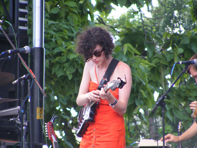 Like Friday, Sunday was pretty good in terms of not featuring many disappointing acts. The two I’m going to mention here weren’t horrible, but let’s just say they were having off days. Honestly, I expected Girls to at the very least try and have fun on stage. It was early afternoon and really hot, but none of the band members really looked like they wanted to be there. Much of their set was filled with slower material that they never felt the need or inclination to speed up for the sake of the venue and weather. I don’t think frontman Christopher Owens cracked a smile once, and though one of the guys in the band said “this is fun”, I was inclined to not believe him. It was only near the end, just before they did “Lust for Life” that things really started to pick up and reach a level that would have made their entire set great had they maintained it from the start. Unfortunately by the time they finally got around to it, too much had already been lost to get back to even. As much as it pains me to say this, because I LOVE Annie Clark, the St. Vincent set was a little odd and lacking in many respects. First of all, though she didn’t mention it, Annie and the band had flown in from Europe less than 24 hours before their Pitchfork set. There may have been some jet lag tiredness there. Also an issue were new arrangements for many of the songs, most likely designed to keep both the crowd and the band interested in what was being played rather than just doing the same stuff over and over again. The revamped songs could have been a gambit that paid off, but that’d require them to be good first. The mix generally felt muddy the entire time as well, with the horns and woodwind instruments turned up much higher than Annie’s vocals and guitar. Like Girls, St. Vincent’s set did get progressively better, and the culminating moment with a loud and brash version of “Your Lips Are Red” was positively inspired. It was the first half that really killed the mood though. That festival set needed more guitar shredding and less attempts at delicate melodies.